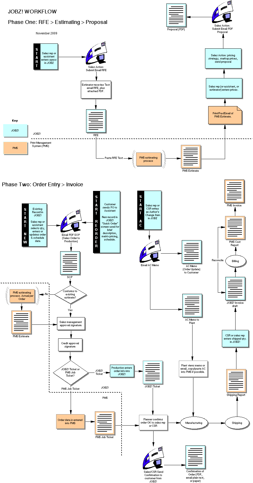 Because JOBZ! uses email to communicate specifications to Estimating, the sales rep’s data can be copied and pasted right into the estimating software screen. These specifications are then a part of the job ticket when it becomes an order. Or, use the JOBZ! Ticket as your manufacturing docket. (See “Topics” Tab for a description.)